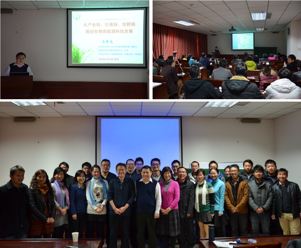 2015年1月14日,中国科学院广州能源研究所马隆龙研究员应邀来我室交流访问,并在作物遗传改良国家重点实验室分子楼114会议室作了题为“从产业链、价值链、创新链规划生物质能源科技发展”的精彩报告。来自我校植科院、理学院、工学院、资环学院,以及生物质能实验室的师生参加了报告会,报告会由彭良才教授主持。