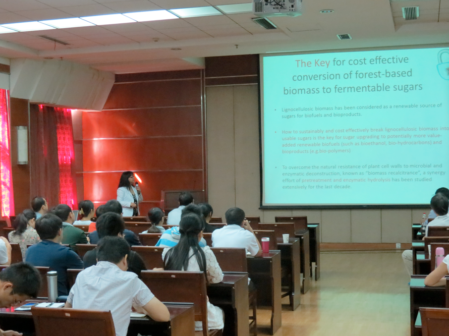 Jihong Liu博士首先介绍了挪威林业所面临的困境,即面对大量的林木资源,如何有效利用并创造产值,以及她团队主要的研究方向:即通过降低预处理和酶解两步的成本来实现林木生物质降解工业化应用。接着,Liu博士详细介绍了其团队利用分子手段在烟草叶绿体中构建产高效纤维素酶生物反应器的计划,并展望了纤维素酶GH61的应用前景。此次报告会引起了参会师生的浓厚兴趣,会后师生积极与Liu博士进行了交流。彭良才教授还就联合培养博士生计划和申报国际合作项目等事宜,与Liu博士交换了意见并取得了共识。