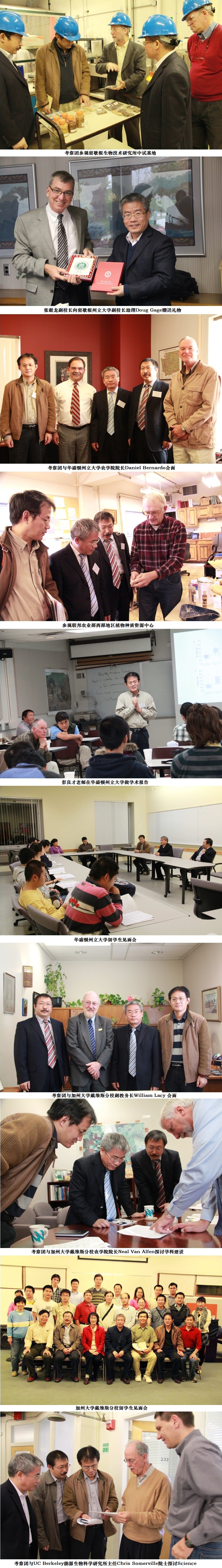 考察团一行先后与密歇根州立大学分管科研和研究生教育的副校长助理Doug Gage,华盛顿州立大学农学院院长Daniel Bernardo,加州大学戴维斯分校分管国际合作的副教务长William Lacy、农学院院长Neal Van Alfen、理学院院长Winston Ko会面,双方在相互简要介绍学校、学院基本情况后,重点就课程建设、研究生培养、人员交流等合作项目进行了深度探讨。张献龙副校长表示,我校具有优美的自然环境、浓厚的科研氛围和踏实的学风学纪,在农学、生物学等领域颇具特色,为推动我校教学科研国际化发展,我们非常欢迎国外教师来校用全英文授课,主讲生物化学、细胞生物学等专业基础课程,并建立教师和学生在校际间的常效交流机制。美国各大学校方代表也纷纷表示,此次访问加深了双方的认识和理解,也发现了很多共性和互补的方面,期待今后陆续建立实质性的合作。