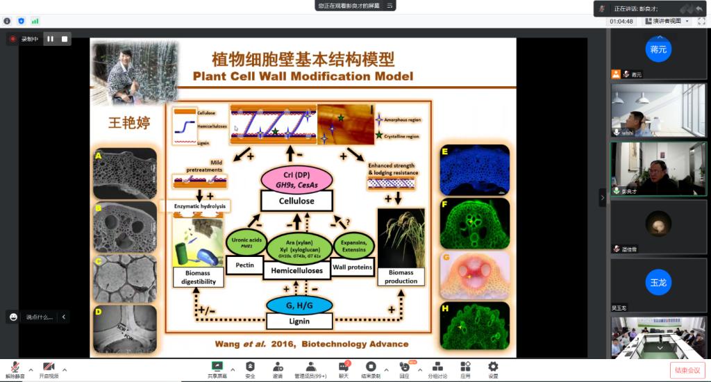 彭老师还系统总结了植物细胞壁基本结构,绘制了木质素-纤维素-细胞壁生物模型。其中,细胞壁中含有非结晶区即细胞壁的软肋,利用物理或化学方法可以将插入的半纤维素提取出来,这样在酶的催化下,处理后的材料就可以生产生物质糖或醇。最后,彭老师将所研究成果即如何更为高效的进行细胞壁改造,进而绿色的、低成本的进行生物质生产进行了详细的介绍。彭老师团队找到了纤维素合酶基因OsFC16、纤维素酶基因OsGH9B1/B3(“凿子基因”)、真菌纤维素酶基因(“定点爆破”基因)等关键基因,这些基因的过表达能够增加植物的抗倒伏能力以及产糖产醇的能力。