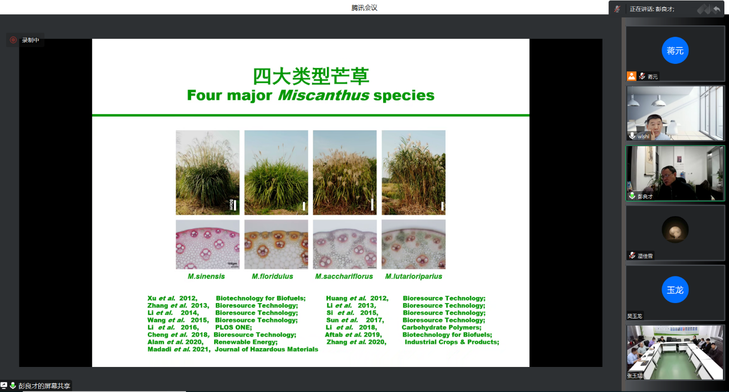 生物质农业是多学科交叉:(1)学科上游是以生物质合成研究为主导的生物学学科,主要是以候选生物质相关的关键基因、解析生物质合成通路为主的基础研究;(2)学科中游是以选育优良生物质材料品种的农业学科,主要是选择适合生物质产业的作物;(3)学科下游则是以生物质能转化为主导的工学学科,主要是进行秸秆等生物质材料转化为糖、醇等生物质能研究;故生物质。接下来,彭老师以芒草为例详细的讲解了生物质产业研究流程。芒草是多年生杂合体植物,生命力强,纤维素含量多。彭老师将芒草的自然群体分为四大类型,并对每种芒草进行多种酸、碱、酶等处理,测量计算芒草生产生物质糖、醇的产量,从而达到从上游源头解决生物质能产业瓶颈问题。此外,彭老师还对水稻、小麦、玉米、高粱等经济作物进行了同样的分析,得到了不同作物之间的生物质能与其植物物种是相关的,并对各种生物质处理方法以及最适产糖醇细胞壁结构进行总结。