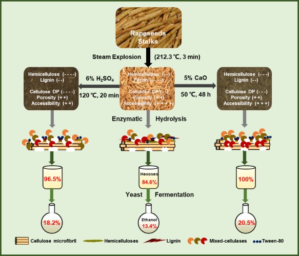该热点论文深入解析了油菜秸秆木质纤维降解转化机制,通过绿色预处理去除大量半纤维素和木质素,可以特异降低纤维素聚合度和结晶度,从而大幅提高木质纤维孔隙度和可及性,再结合表面活性剂阻抑木质素吸附纤维素酶,致使油菜秸秆生物质可完全降解,并转化为最高产量的生物乙醇。故该模型不仅从理论上解析了木质纤维高效酶解产糖产醇的分子机理,还从应用上提供了一条绿色、低成本降解转化优质油菜秸秆的新途径,亦为其它作物秸秆高效综合利用提供了绿色环保的新策略。