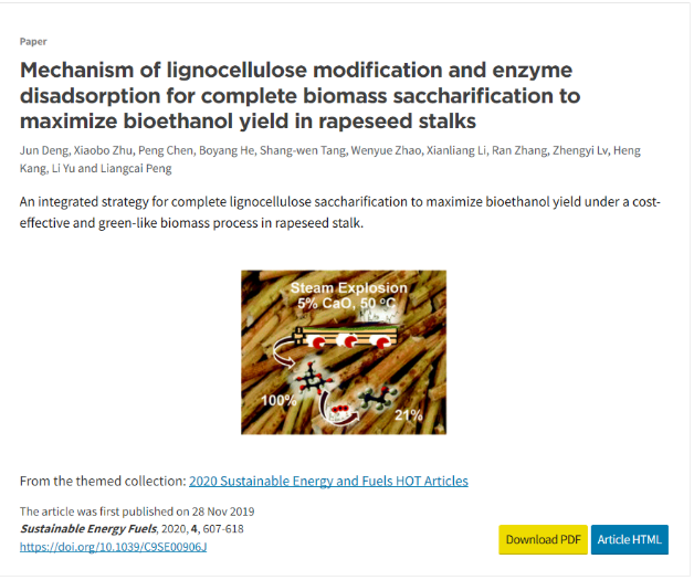 2020年4月5日,生物质能团队2019年11月发表于英国皇家化学学会(RSC)可持续能源国际著名学术期刊Sustainable Energy & Fuels上的论文“Mechanism of lignocellulose modification and enzyme dis-adsorption for complete biomass saccharification to maximize bioethanol yield in rapeseed stalks”入选该杂志热点论文(HOT Articles),2020应届硕士生邓俊和2017届硕士朱晓博为该论文共同第一作者。邓俊同学2014年通过植科院硕彦计划,进入生物质能团队学习,2019年还以第二作者身份在绿色化学领域顶级学术期刊Green Chemistry杂志发表一篇研究论文。