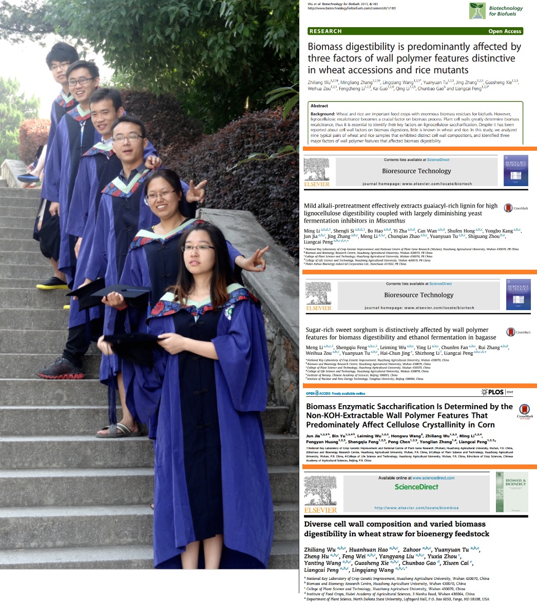 生物质能团队依靠作物遗传改良国家重点实验室和植物科学技术学院平台, 近3年,己在Plant Biotechnol J, BMC Genomics, BMC Plant Bio, Planta, Plant Sci, JIPB, BBRC, Biotechnol Biofuels, Bioresour Technol, Biomass Bioenerg等杂志发表SCI论文16篇,其中10篇由硕士生作为第一作者完成。这些学生一部分作为硕博连读生继续攻读博士学位,一部分毕业后前往德国亚琛工业大学、美国北达科他州立大学、香港大学、香港城市大学、中国农业大学、中南大学等国内外知名高校留学升造或工作,还有一部分在美国辉瑞制药公司、美国先锋种子公司、中国种子集团、大北农科技集团、阳光凯迪新能源集团等国内外知名企业工作。据悉,团队明年初将迎来第1位硕博连读生毕业,该生已在Bioresour Technol 和Plant Biotechnol J ( 5年影响因子为5.913 ) 上以第一作者发表2篇SCI论文,以合作作者发表SCI论文3篇,目前正在准备将第3篇第一作者论文投往影响因子更高SCI期刊。