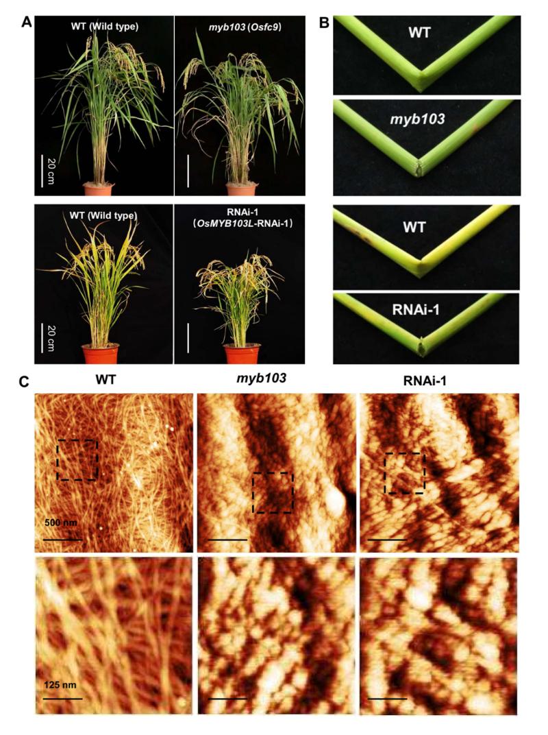 图1.OsMYB103L突变体和转基因植株表型和微纤丝纳米结构观测