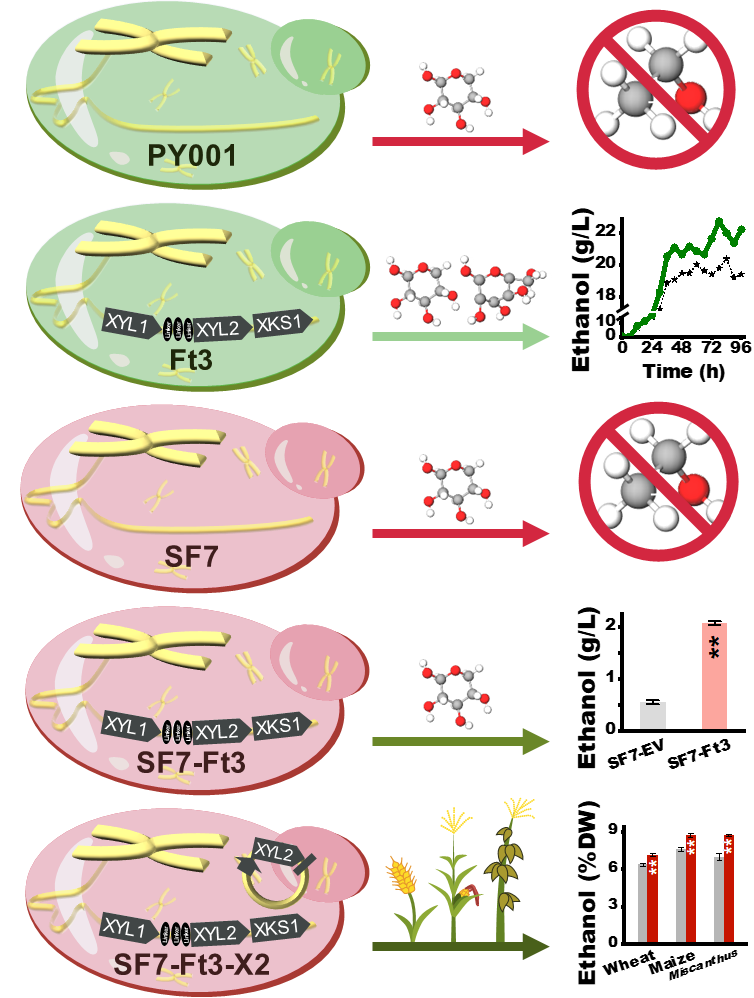 传统酿酒酵母的木糖代谢能力低,木糖的有效利用成为木质纤维生物质高效转化的瓶颈问题。已有研究在改良酿酒酵母木糖代谢途径方面开展了大量工作,包括异源表达木糖还原酶XYL1(XR)和木糖醇脱氢酶XYL2(XDH)基因,但由于木糖醇分泌的积累,导致细胞内氧化还原失衡,重组酿酒酵母对木糖发酵缓慢,乙醇产量低。夏涛团队通过筛选合适的融合蛋白连接XDH和XR,同时优化重组菌株的XDH/XR的活性比,达到酿酒酵母高效利用木糖生产乙醇目的。在工业酿酒酵母SF7中,采用基因融合技术表达XYL1和XYL2的重组菌株SF7-Ft3,可以消耗95%木糖。在重组菌株SF7-Ft3过表达XYL2,可持续提高小麦、玉米秸秆和芒草的木糖利用,使生物乙醇产率提高11%-42%。该研究为酵母工程高效利用木糖提供了新策略,并获得2项国家发明专利。
