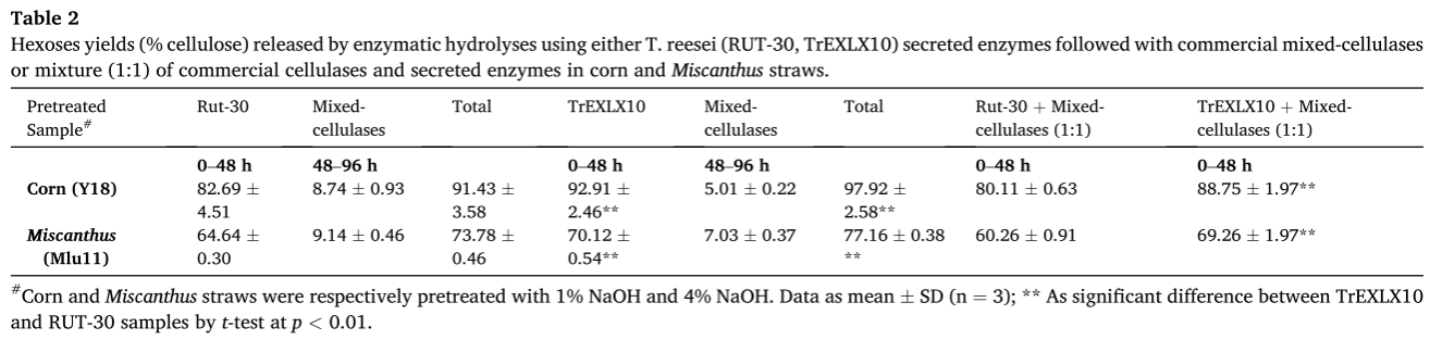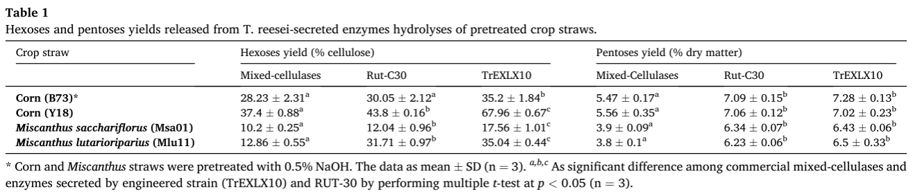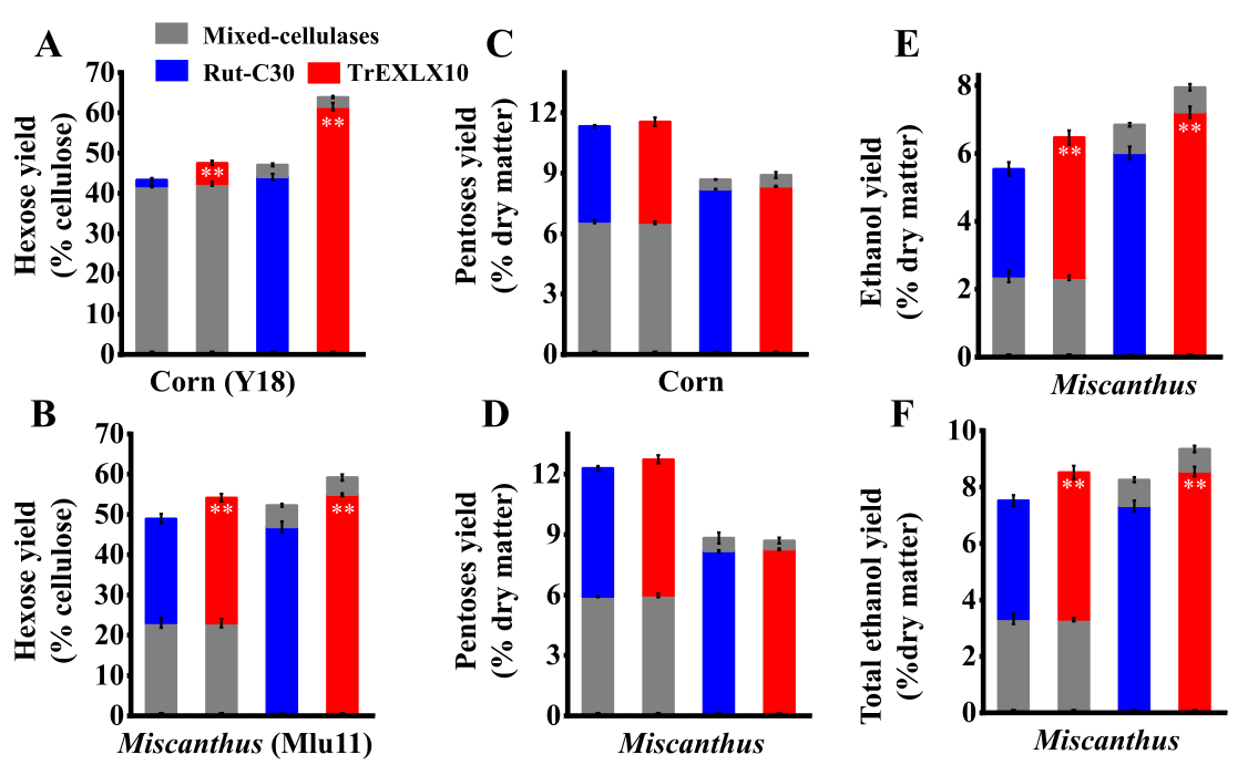 为了证实TrEXLX10分泌的酶水解提高了己糖产量,本研究进一步测试了四种玉米和芒草秸秆的生物质糖化,通过使用商业混合纤维素酶或TrEXLX10或Rut-C30菌株分泌的粗酶进行一步水解。TrEXLX10分泌的纤维素酶水解物的己糖得率显著高于RUT-C30或混合纤维素酶,己糖得率提高55%,在这三个水解反应中也确定了相似的戊糖产量。