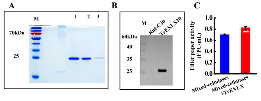 由于工程培养的TrEXLX10菌株能够分泌活性膨胀素,对生物质酶糖化过程进行非催化增强,本研究利用His-tag特异性从粗酶液中纯化膨胀蛋白,与EXLX蛋白连接(图4A)。进一步将纯化的膨胀素加入到商业混合纤维素酶中,在体外实验中,与不添加膨胀素的对照实验相比,FPA显著提高(p<0.01) (n=3)(图4C),这为TrEXLX10菌株也可以分泌活性膨胀素以协同增强作物秸秆生物质酶糖化的假设提供了证据。