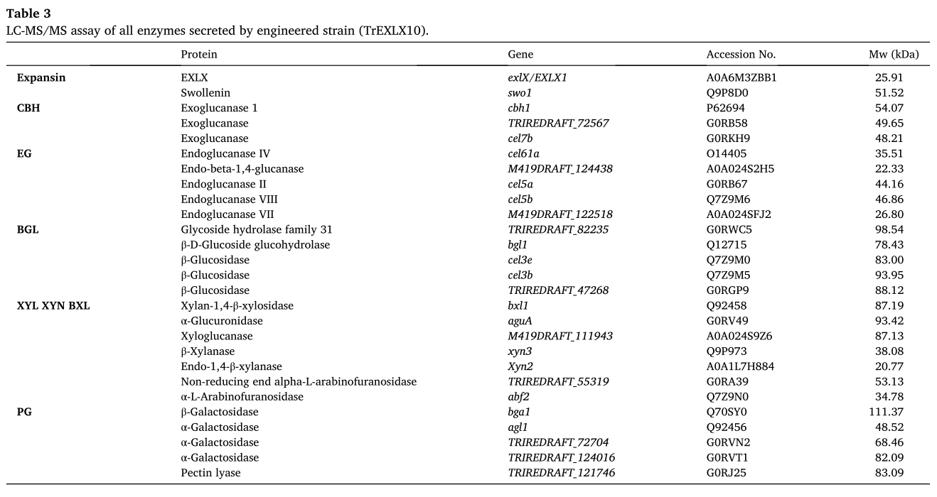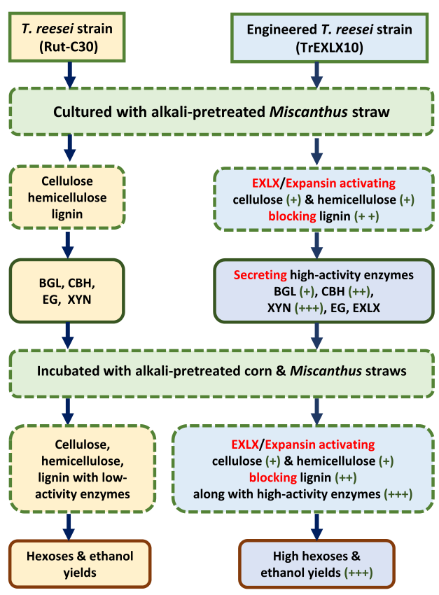 由于其优越的分泌能力,里氏木霉已被广泛应用于生产商业木质纤维素降解酶的主要工业真菌菌株。里氏木霉菌株需要分泌不同类型的酶来完全消化木质纤维素。例如,内切-β-1,4-葡聚糖酶通过断裂纤维素微纤维的无定形链来释放低聚糖,而纤维生物水解酶断裂纤维素链以产生纤维二糖。因此,最终需要β-葡萄糖苷酶来消化纤维二糖以生产可发酵的葡萄糖。同时,里氏木霉还分泌各种木聚糖酶用于半纤维素水解。然而,由于所有类型的酶都由几种异构体组成,生物量降解酶的最佳组合在很大程度上是不同的,这取决于木质纤维素的特性。一种细菌膨胀素(BsEXLE)蛋白具有与预处理过的木质纤维素残基高度结合的活性,但其在里氏木霉体内分泌木质纤维素降解酶和体外生物质酶糖化中的级联应用尚不清楚。