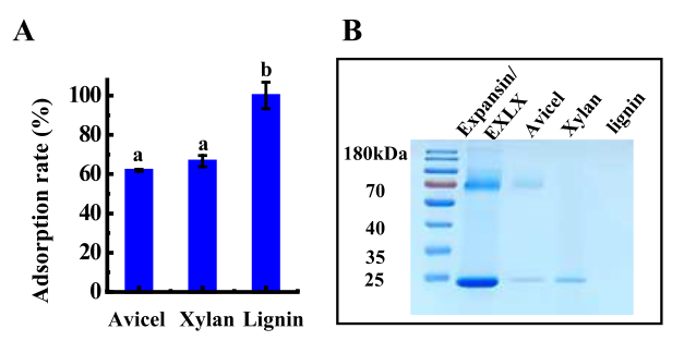 由于TrEXLX10分泌的膨胀素对提高生物量酶解率具有协同作用,进一步纯化了膨胀素,并与三种标准底物进行体外培养(Avicel,木聚糖和木质素),他们是主要作物秸秆中木质纤维素残基的三种主要壁聚合物。测定了TrEXLX10分泌的膨胀素与木质素底物具有最高的结合活性,而Avicel和木聚糖底物具有相似的结合活性(图5A)。然而,BsEXLX1与木质素的结合活性仅比Avicel和木聚糖底物高出<40%。同时,与以前鉴定的与木质素结合活性为主、与壁多糖相互作用较小的蛋白质相比,TrEXLX10分泌的膨胀素与纤维素和半纤维素底物保持了相对较高的结合活性,证实了其在改善不同木质纤维素底物的顽固性方面的独特作用。这也可以解释为什么TrEXLX10菌株可以分泌不同类型的纤维素酶和木聚糖(表3),主要是因为它与所有主要的壁聚合物具有高度的结合活性。