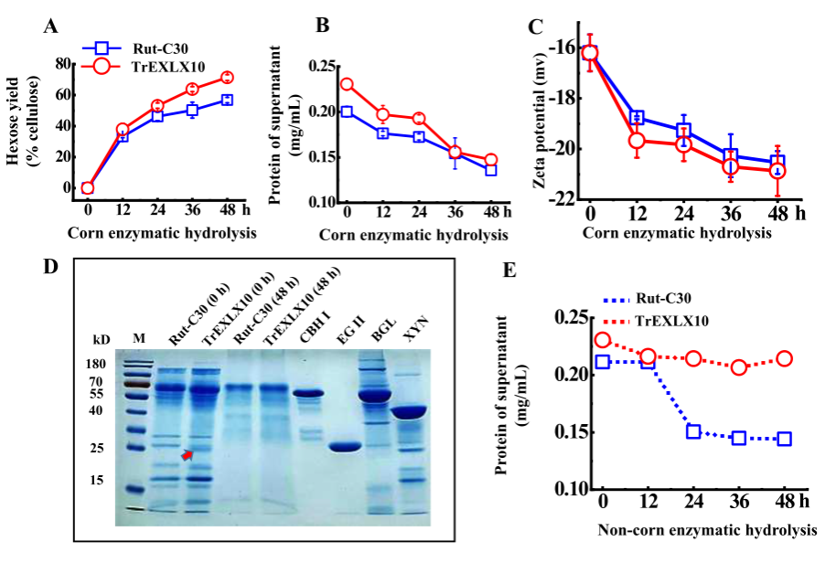 为了了解TrEXLX10分泌的酶对生物质糖化的持续增强作用,本研究使用TrEXLX10或Rut-C30菌株分泌的粗酶对玉米秸秆进行了时间过程酶解(图3)。作为对比,TrEXLX10分泌的酶解不断释放出比Rut-C30样品更高的己糖产量,在48h酶解后,己糖产量大多提高到26%(图3A)。TrEXLX10分泌酶水解物上清液的Zeta电位值相对较低(图3C)。通过SDS-PAGE对可溶性蛋白进行分离,TrEXLX10样品的CBH、BGL和XYN三种酶对应的条带明显强于Rut-C30样品(图3D),说明TrEXLX10较高的蛋白水平主要来源于分泌较多的生物量降解酶。因此,它提供了直接的证据来解释为什么不同类型的酶活性在TrEXLX10分泌的溶液中显著提高,以获得更高生物量的酶糖化。