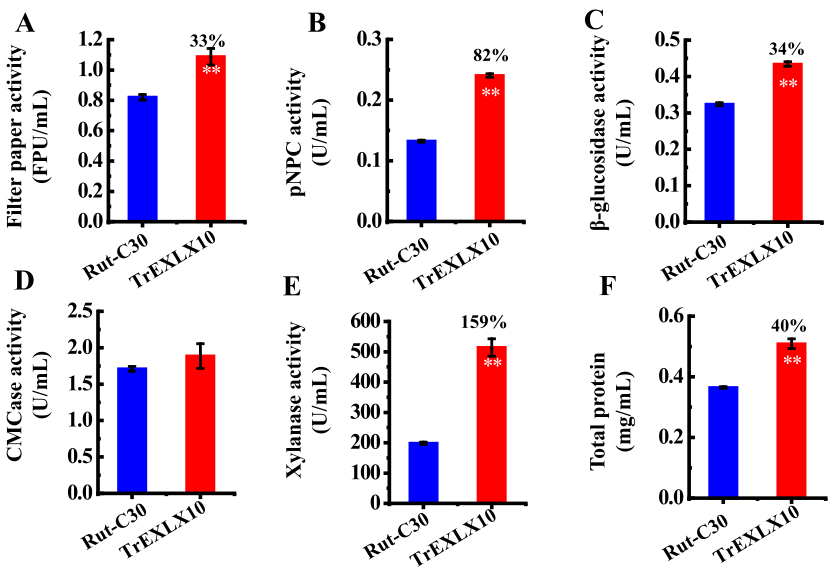在这项研究中,BsEXLX1基因最初被克隆到用Ppdc启动子驱动的里氏木霉菌株(Rut-C30)中过表达。本研究通过对10个转基因里氏木霉品系TrEXLX1-10的筛选,收集其分泌的粗酶,并测定其体外滤纸活性。作为比较,TrEXLX10菌株被选为以下实验的理想工程菌株,因为其检测到的PFA最高(图1)。本研究分别测定了工程TrEXLX10和Rut-C30菌株体外分泌的五种酶活性(图A-E)。除了类似的CMC酶活性外,TrEXLX10菌株中其他四种酶的活性均显著高于Rut-C30菌株,且p<0.01(n=3)。特别是,TrEXLX10菌株的木聚糖酶和β-葡萄糖苷酶活性分别提高了159%和82%,而其滤纸和pNPC活性分别增加了32%和34%。同时,TrEXLX10菌株的总蛋白水平也比Rut-C30菌株高40%(图1F)。由于BsEXLX已被表征为能够与木质纤维素底物结合的活性膨胀素,因此研究结果表明,TrEXLX10菌株最初可能分泌足够的膨胀素来激活芒属木质纤维素底物,以促进里氏木霉消化纤维素和半纤维素作为碳源,从而导致所检测的TrEXLX10菌株有效分泌纤维素酶和木聚糖酶。
