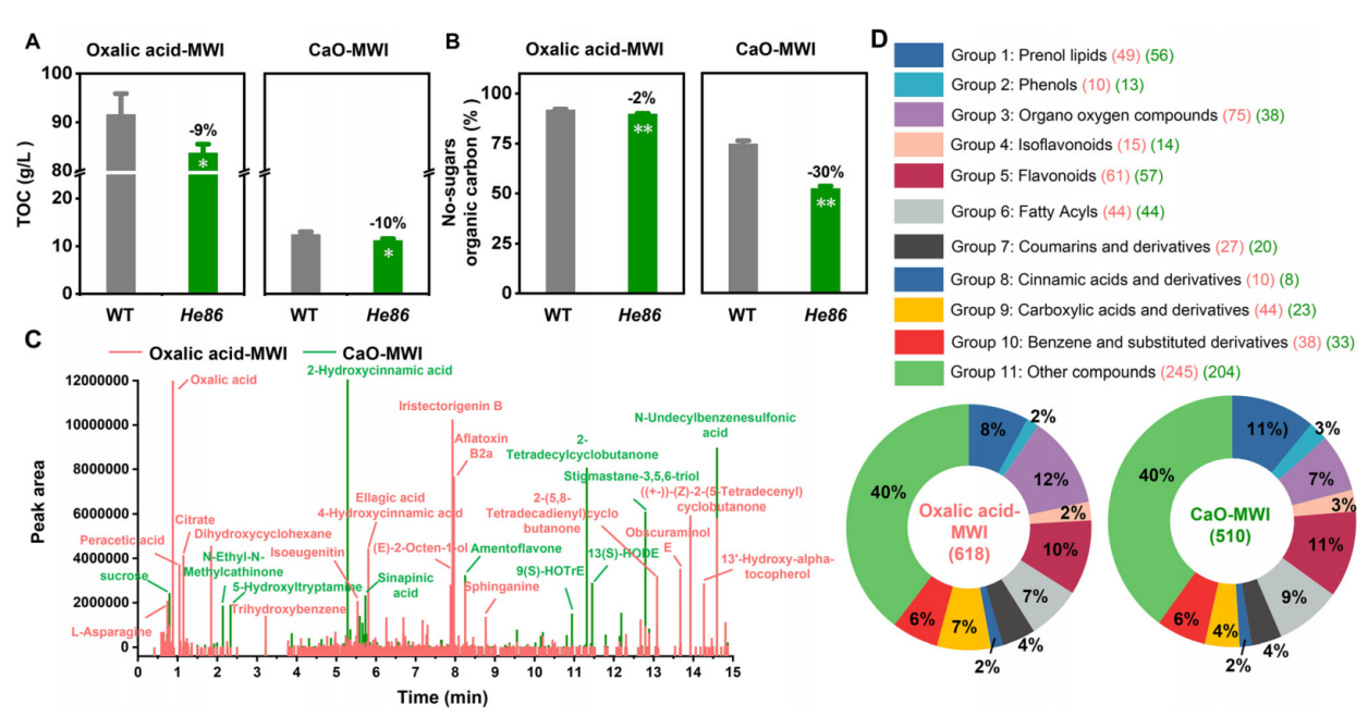 通过对预处理前后生物质细胞壁成分分析,发现这两种优化后的组合预处理方式均能解聚和共提取细胞壁聚合物,可提取54%-72%半纤维素和51%-59%木质素,有效破除了生物质的天然抗降解屏障。利用BET、SEM、FTIR、XRD和CR染色吸附等技术表征,发现预处理后可以显著提高生物质的比表面积和孔隙度,同时有效降低纤维素聚合度,从而提高木质纤维素的酶解糖化的可及性。利用TOC和LCMS等技术分析发现He86预处理水解液有更少的发酵抑制化合物的释放。