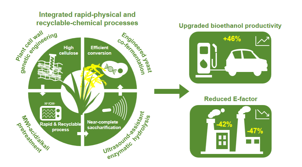 本研究提出一种可以提高生物质转化利用效率的绿色组合技术:通过植物细胞壁遗传工程,精准提升水稻秸秆的细胞壁纤维素含量;结合快速和可循环的酸碱微波预处理方式,充分解聚细胞壁以降低生物质的抗降解性;在纤维素复合酶的酶解糖化过程中,采用间歇超声以提高纤维素的可及性,实现近乎完全酶解;利用可发酵木糖的工程酵母菌株进行生物质乙醇发酵,最终在显著提高生物乙醇产量的同时降低环境污染排放。这一结合生物、物理和化学等多种手段的新型绿色组合技术阐明了经基因工程修饰的木质纤维素如何通过组合生物技术实现完全降解与高效转化,这为精细木质纤维素改良和高效生物质利用提供了新的见解。