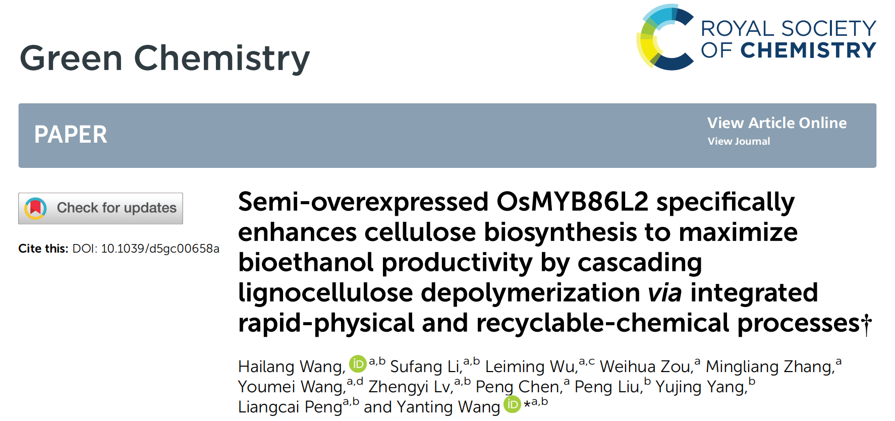 近日,湖北工业大学生物质与生物能源团队在国际绿色化学领域权威期刊Green Chemistry(IF=9.2)在线发表了题为“Semi-overexpressed OsMYB86L2 specifically enhances cellulose biosynthesis to maximize bioethanol productivity by cascading lignocellulose depolymerization via integrated rapid-physical and recyclable-chemical processes”(DOI: 10.1039/d5gc00658a)的封面文章。该研究揭示了细胞壁合成调控转录因子的适度表达、协同低成本绿色组合预处理方式,可显著提高水稻秸秆的生物乙醇转化效率,同时减少环境污染排放,为农林废弃物的绿色高值利用提供了新的技术与思路。