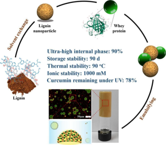 木质素是植物细胞壁的重要组成部分,也是自然界中最丰富的天然芳香族高分子之一。然而,在传统生物质加工过程中,大量木质素往往被低值利用甚至废弃。如何实现木质素的高附加值转化,是生物质资源利用领域的重要科学问题。与此同时,高内相皮克林乳液由于分散相体积分数高、包封效率高和流变性能优良,在食品加工、多孔材料模板及药物递送等领域具有重要应用潜力,但其稳定性高度依赖高性能固体颗粒稳定剂。