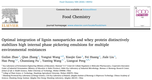 近日,国际食品领域期刊Food Chemistry(中科院一区,影响因子9.8)发表了我院生物质与生物能源团队博士生赵贵兰在生物基功能材料研究方面的新进展。该研究创新性地利用木质素纳米颗粒与乳清蛋白协同组装,成功构建了高性能、高内相皮克林乳液体系,为木质素资源的高值化利用及绿色生物材料开发提供了新思路。