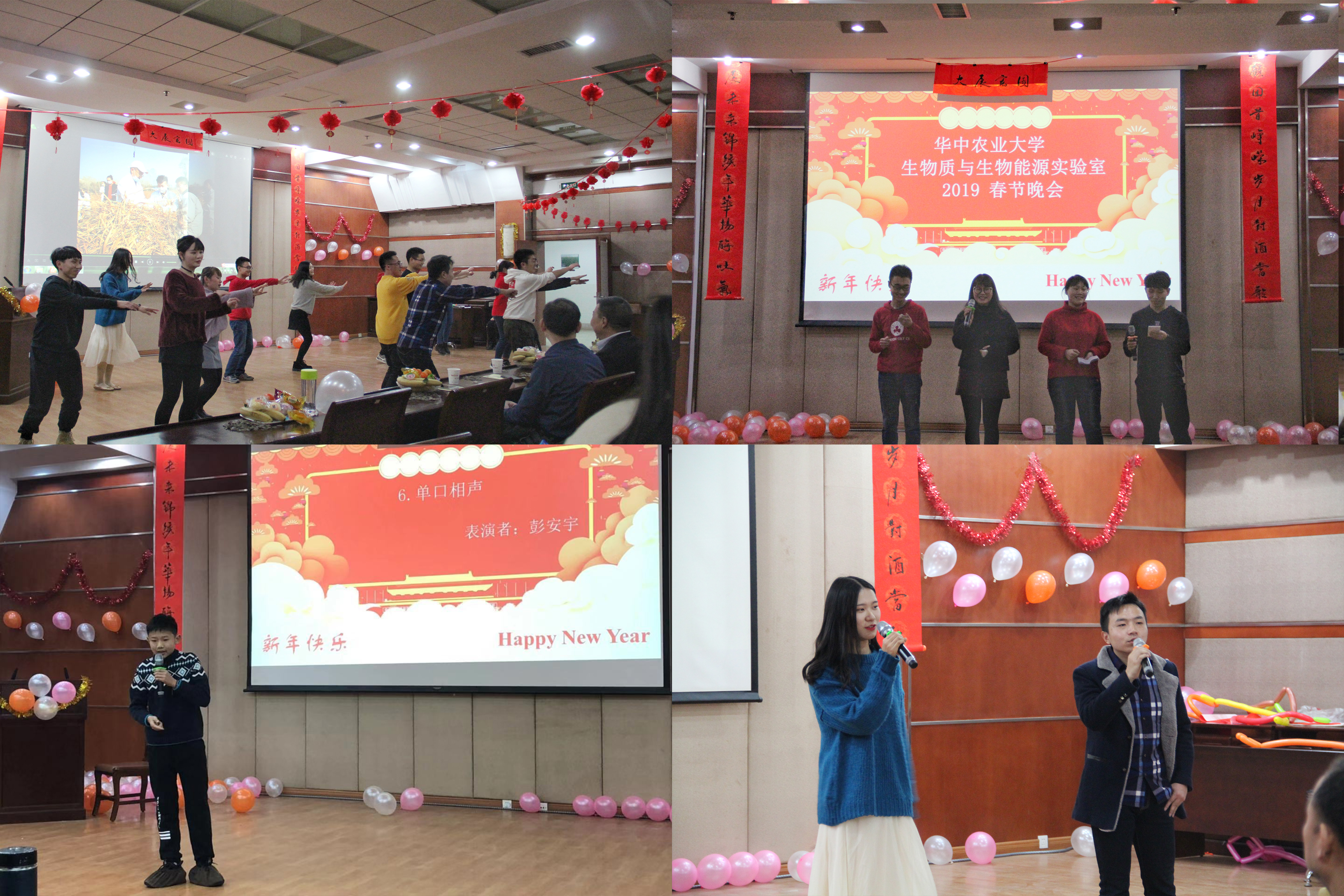 1月25日下午,2019年生物质与生物能源实验室(BBRC)春节联欢会在分子楼103报告厅举行。舞台中央,“顾回首,峥嵘岁月,对酒当歌”“展未来,锦绣年华,扬酶吐气”“大展宏图”的红色对联映入眼帘,会议室张灯结彩,灯笼高挂,学生们舞动青春,老师们一展歌喉。农业部环保所重金属生态毒理团队首席科学家刘仲齐研究员,湖南农业大学副院长张学文教授,重庆市医疗保障局党组书记蒋建国博士,BBRC全体师生及家属参加了本次联欢会。