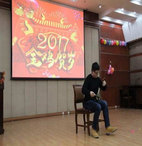 伴随着台下同学们的喝彩声,两位主持人孙梦丹和吴悦同学款款走上舞台,激情的话语将老师和同学们带入到晚会的浓厚氛围中来。彭良才老师首先为大家送上新年致辞,为即将到来的酉鸡年送上祝福和期盼,希望所有同学在新的一年里勤奋学习,身体健康,实验室在新的一年取得更好的成绩。随后,精彩纷呈的晚会节目陆续登场。徐成宝和他的舞伴为大家带来了节奏欢快的拉丁舞《激漾青春》,柔美的舞姿引得台下阵阵尖叫。而由彭安宇小朋友为大家带来的单口相声,有板有眼,让大家不禁为这个小家伙竖起了大拇指。为了让更多人的人都能够参与进来,晚会进入到第一个游戏环节——你比我猜,由主持人随机抽取几组同学上台进行互动,每组成员都配合的相当默契,比赛进行得也非常激烈,夸张搞笑的动作比划和生动的语言表达将晚会带入到一个小高潮。