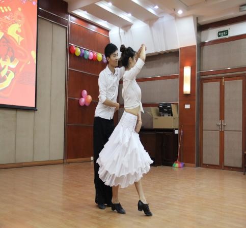 精彩未央,晚会还在继续。许超、张和平和孙梦丹等人为大家带来小品《白蛇传》惊艳了全场,自制的夸张服装,幽默的语言,以及精湛的演技,把白素贞和许仙的爱情故事演绎得另类且栩栩如生,让大家在捧腹的同时由衷地感叹爱情的美好。主持人吴悦随即为大家带来了《月半小夜曲》,让每个人都一饱耳福。看到学生们的表演如此精彩,老师也按捺不住身体里的“艺术细胞”,急忙上台亮出自己的“绝活”,郝老师即兴为大家清唱了一段样板戏《智取威虎山》的插曲,让同学们感受到传统戏曲的魅力。在领略了东北的冰天雪地和壮士的铮铮铁骨,曾虎为大家带来了二胡独奏《赛马》,或快或慢的节奏,或高或低的音符,让每个人仿佛置身于茫茫大草原上,身体和心灵都得到了放松。由彭良才老师和涂媛媛老师为大家带来的压轴节目——交谊舞,则将晚会推到了最后的高潮,他们优美的舞姿和默契的配合给大家留下了深刻的印象。
